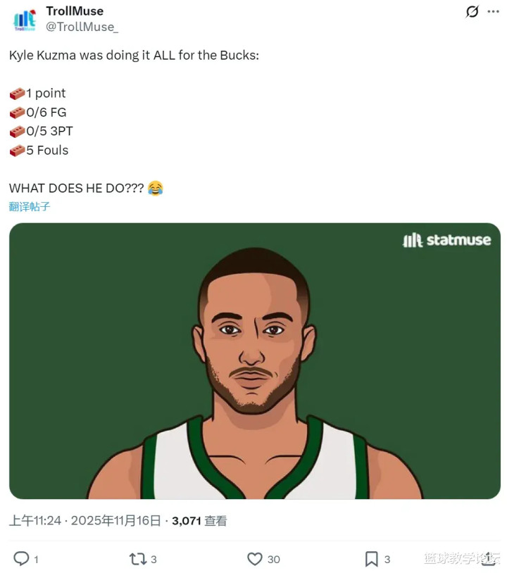 November 16, NBA regular season: The Bucks lost to the Lakers 95-119. Bucks forward Kuzma started the game for 19 minutes and 35 seconds, making 0 of 6 shots, 0 of 5 three-pointers, 1 of 2 free throws, only 1 point, 1 rebound, 1 turnover and 5 fouls, with a plus-minus value of -17. Even the media was helpless and wrote after the game: Master, what do you do?