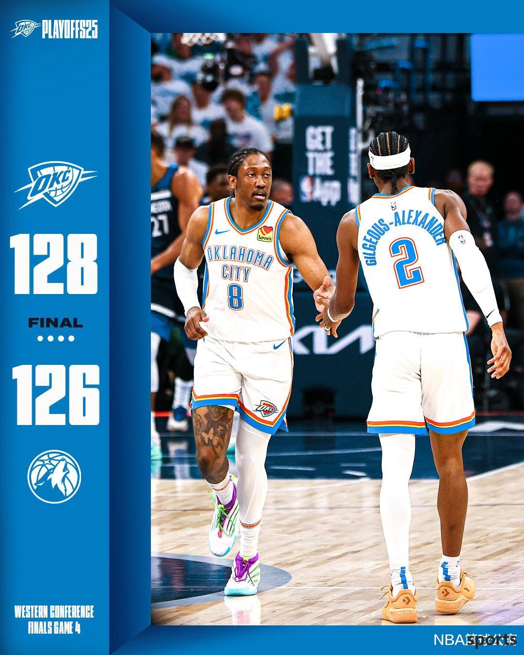 Alexander made all two free throws, Edwards made the first free throw, but missed the second free throw. Alexander got the ball and threw it out of the field, with 0.3 seconds left in the game. Jaylen Williams steals Randle's serve in the backcourt and the game time is over. In the end, the Thunder narrowly defeated the Timberwolves 128-126 and were able to win the next match point. The G5 showdown between the two sides will be held at OKC home court.