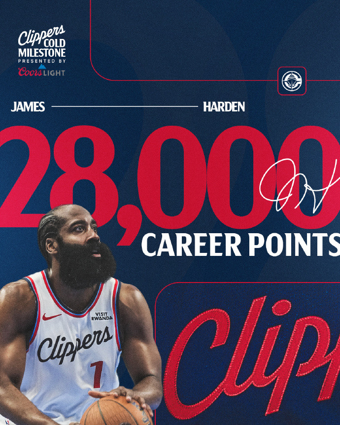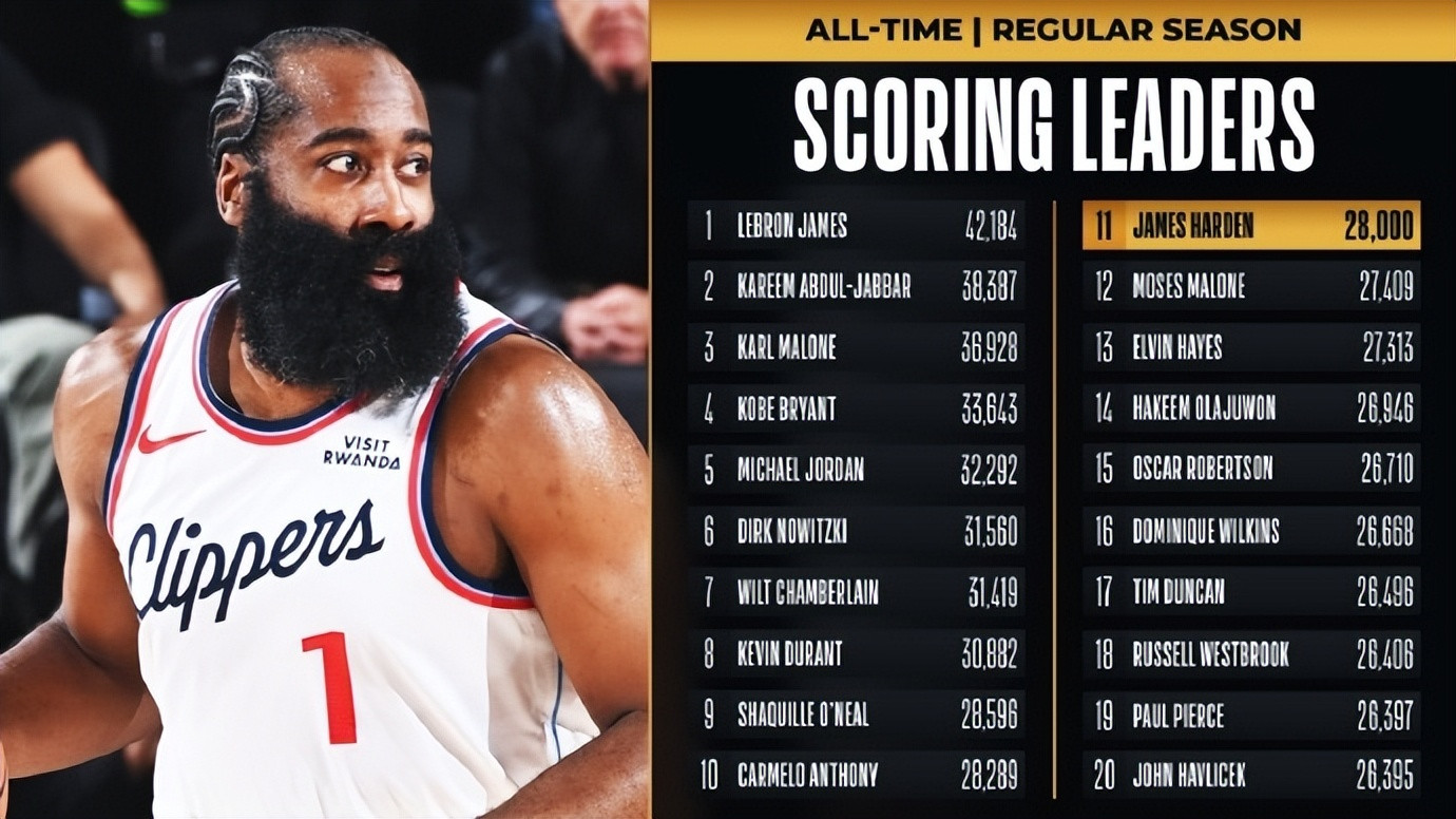 Although he lost the game, Harden also reached an important milestone, that is, his career total score officially exceeded the 28,000-point mark, becoming the 11th player in NBA history to achieve this achievement, and the third active player to achieve this after James and Durant. In addition, Harden will soon surpass Anthony (28,288 points) and join the top ten in the history of scoring.