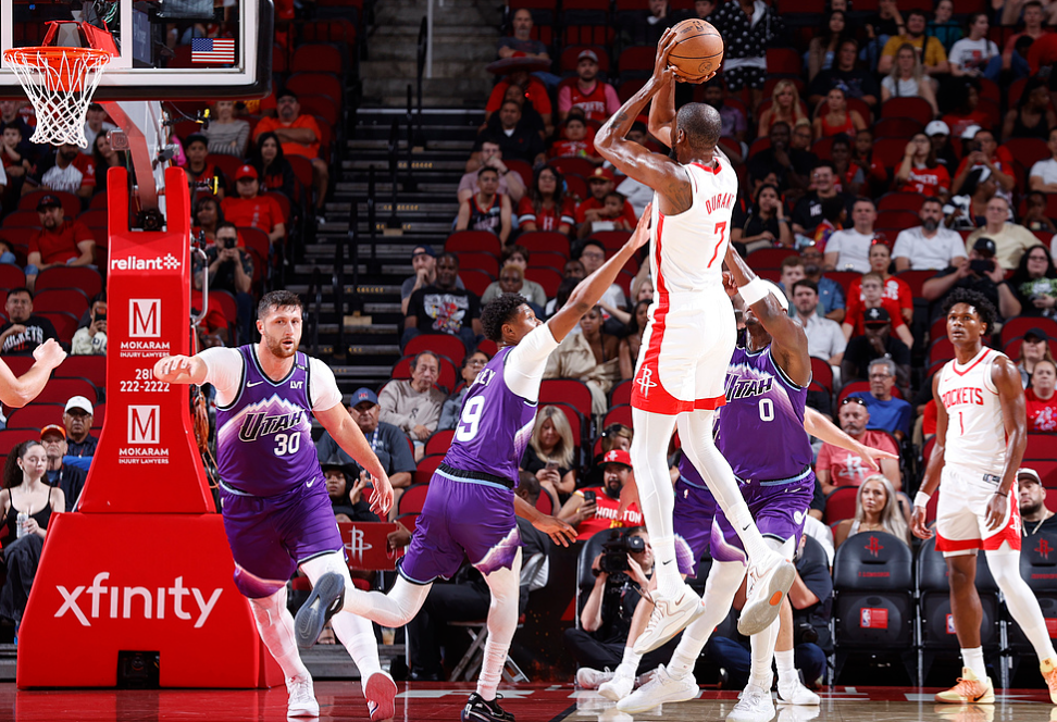On October 9, the Rockets played against the Jazz in the NBA preseason. Kevin Durant officially ushered in his first game after joining the Rockets. He started for 23 minutes and 27 seconds. He made 7 of 10 shots and scored 20 points, 2 rebounds, 1 assist, and 1 steal. After 0 of 3 starts, he scored 7 goals in a row. His hands exploded with dunks that lit up the arena. Durant even sprayed Pele wildly to welcome him to the NBA.