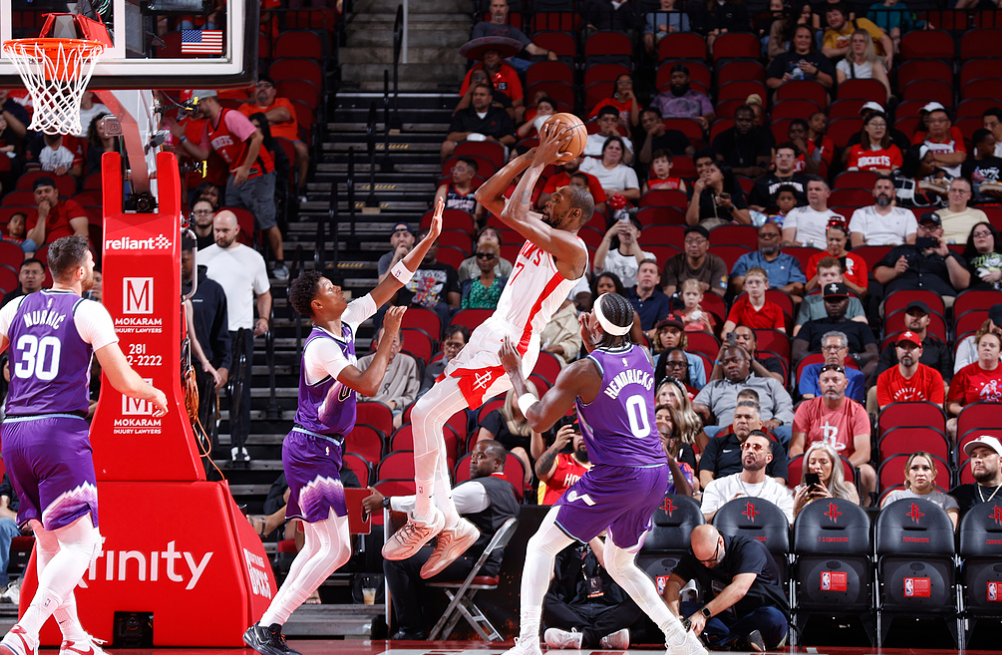 Durant appeared wearing the Rockets No. 7 jersey. This was his first game for the Rockets. He started the game with Shen Jing, Amen, Jabari Smith Jr. and Shepherd. Durant was smiling very happily when he came on the stage.