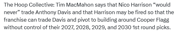 MacMahon also said Nico Harrison would "never" be traded for Anthony Davis, but that Harrison could be fired so the team can trade Davis and rebuild around Flagg, who is now without first-round picks in 2027, 2028, 2029 and 2030.