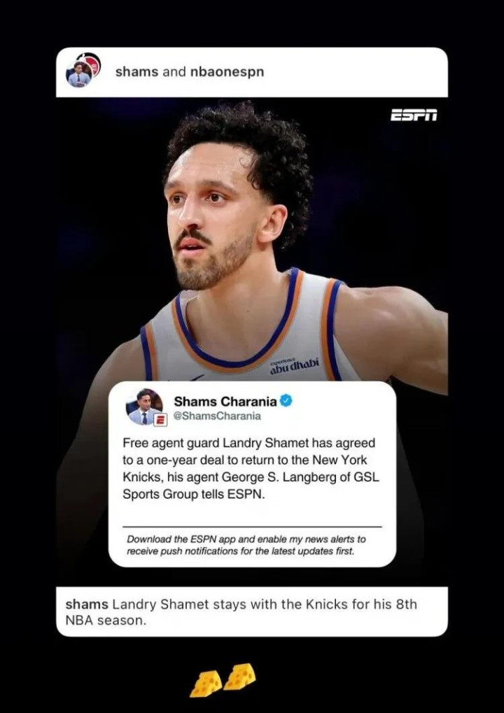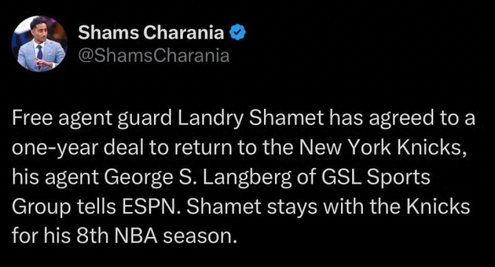 Shams: Free agent Landry Shamet agrees to return to the Knicks on a one-year contract. Immediately afterwards, team reporter Bondy added that Shamet signed an unsecured contract.