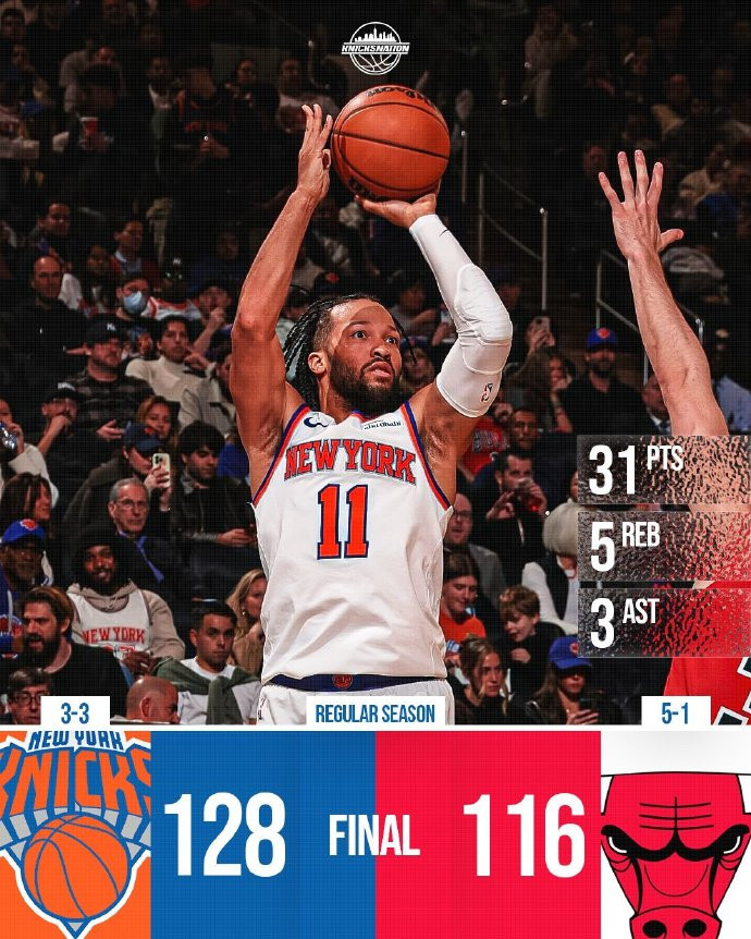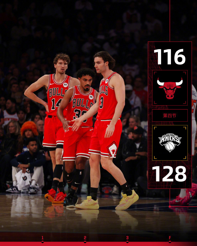 After winning five consecutive games at the start, the Bulls lost to the Knicks 116-128 on the road today, suffering their first defeat of the season and ending their five-game winning streak. Fortunately, the 76ers have suffered their first defeat of the season before. They currently have the same record as the Bulls at 5 wins and 1 loss. The 76ers are temporarily ranked first in the Eastern Conference, and the Bulls are ranked second in the Eastern Conference. The Knicks had suffered a three-game losing streak before, so today's victory is also very important to them, but their current record is still only 3 wins and 3 losses.