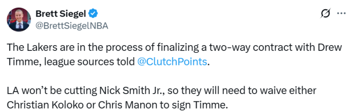 Currently the Lakers' three two-way contract spots have been occupied by Nick Smith Jr., Christian Koloko and Chris Manon. Siegel learned that Nick Smith Jr. will not be a candidate for elimination, so the team will most likely fire either Coloko or Manon to make room for Timmy.