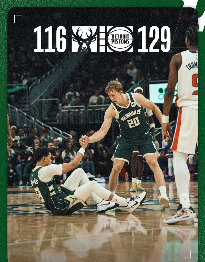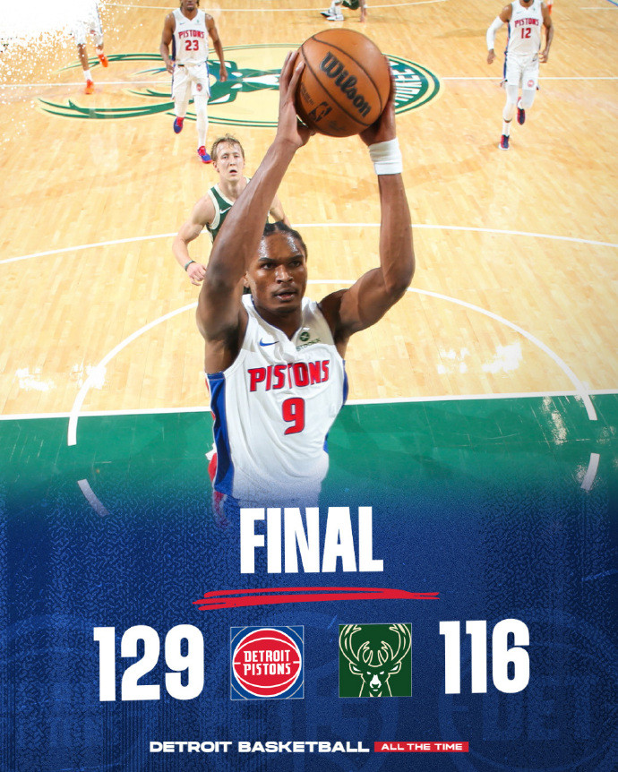 The Pistons defeated the Bucks without Giannis Antetokounmpo 129-116 on the road today, gaining 12 consecutive victories and giving the Bucks 4 consecutive losses. It is worth mentioning that as long as they defeat the Pacers in the next game, the Pistons can tie the longest 13-game winning streak in team history. The Pistons currently have a record of 14 wins and 2 losses, continuing to rank first in the Eastern Conference. The Bucks have a record of only 8 wins and 9 losses, falling out of the top ten in the Eastern Conference.