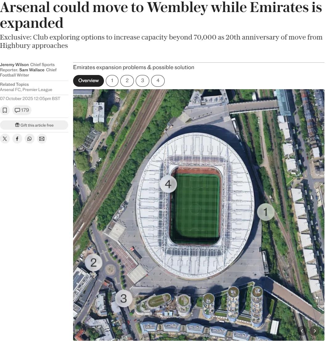 Telegraph reporter JW and SW jointly issued a statement saying that Arsenal is planning to expand the Emirates Stadium on a large scale, which may lead to their temporary home game relocating to Wembley Stadium. Judging from the current planning details, this expansion may expand the Emirates Stadium's capacity of 60,700 people to more than 70,000 people.