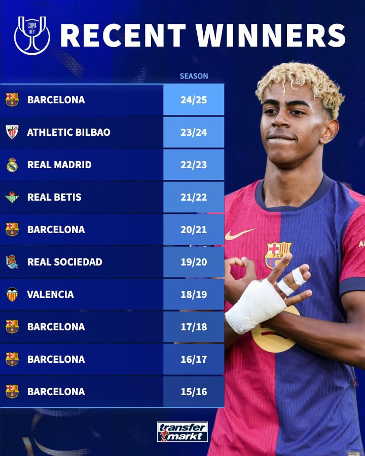 Hupu, October 29th, the German transfer market has compiled statistics on the teams that have won the Spanish Cup in the past 10 seasons: