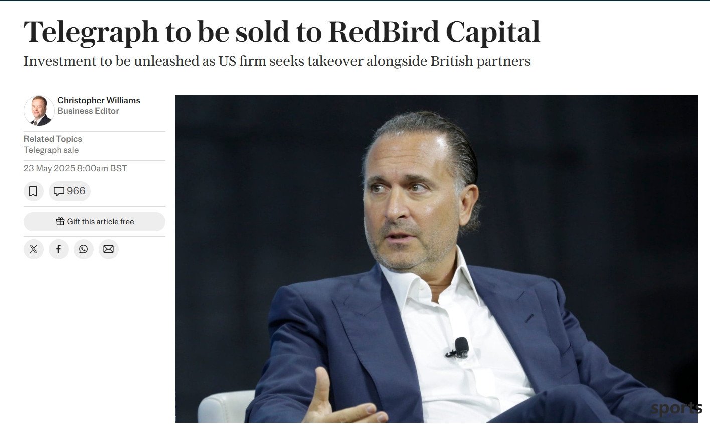 As the provider of one-quarter of the funds of Redbird IMI, Redbird Capital now plans to directly control the media giant and is expected to form a new holding alliance with local British media investors. The acquirer has formulated an ambitious development plan to accelerate the expansion of the Daily Telegraph in domestic and international markets.