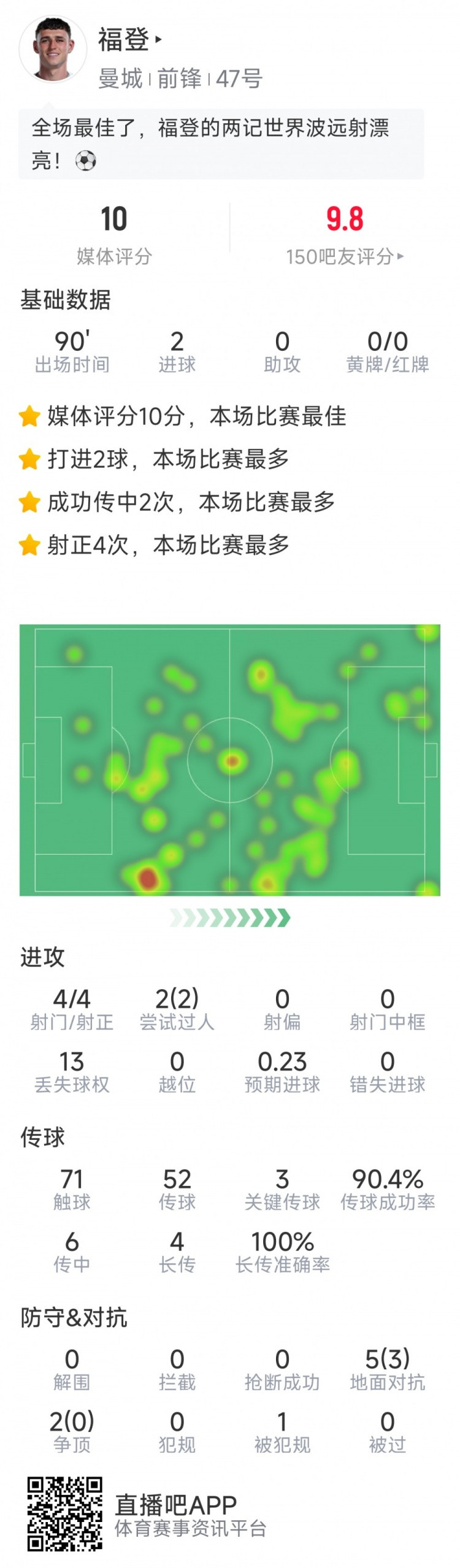 November 6 News In this round of the Champions League, Manchester City defeated Dortmund 4-1. The following are Foden's statistics for this game: