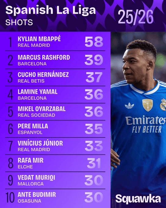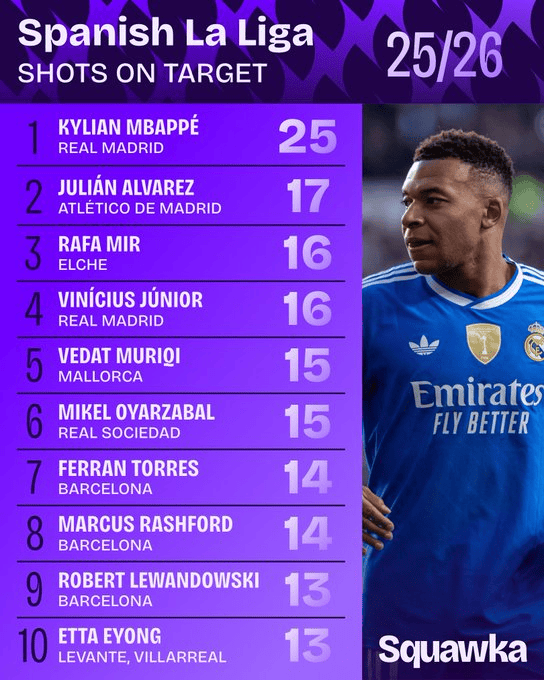 La Liga shots/shots on target list: Mbappe leads the way with 58/25 shots on target, and Spider-Man ranks second in shots on target