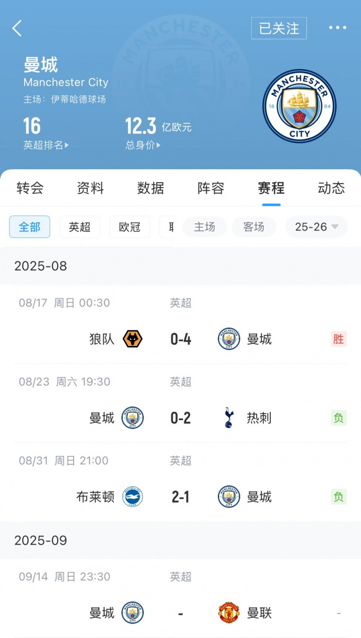 September 14th news: 23:30 tonight, the fourth round of the Premier League Manchester City derby will begin, and Manchester City, which lost two consecutive games, will face Manchester United at home. If Manchester City loses again, it will break a 30-year record.