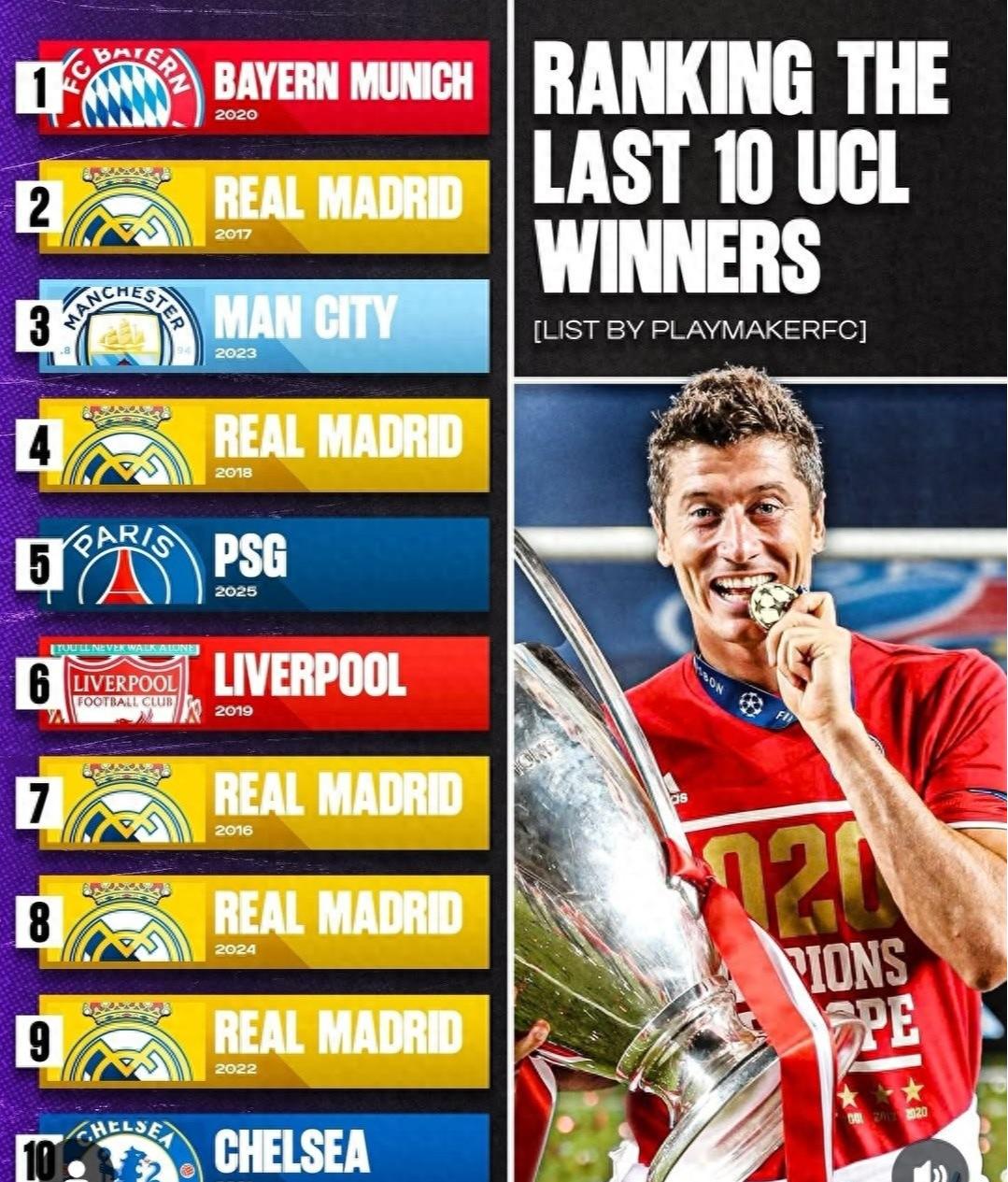 In the past 10 years from 2016 to 2025, a total of 6 teams have won the Champions League championship in these 10 years-Real Madrid, 2016, 2017, 2018, 2022, 2024; Liverpool, 2019; Bayern Munich, 2020; Chelsea, 2021; Manchester City, 2023; Paris Saint-Germain, 2025.