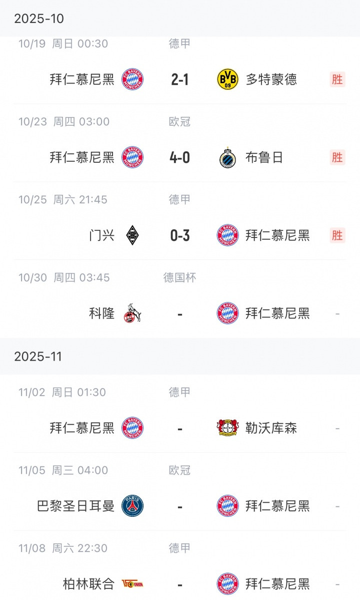 October 26th After defeating Borussia Monchengladbach at the weekend, Bayern started the season with a 13-game winning streak in all competitions.