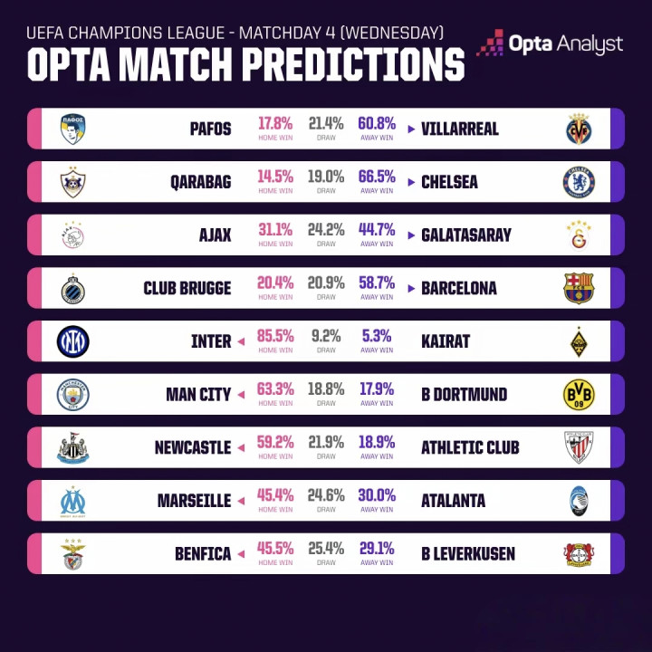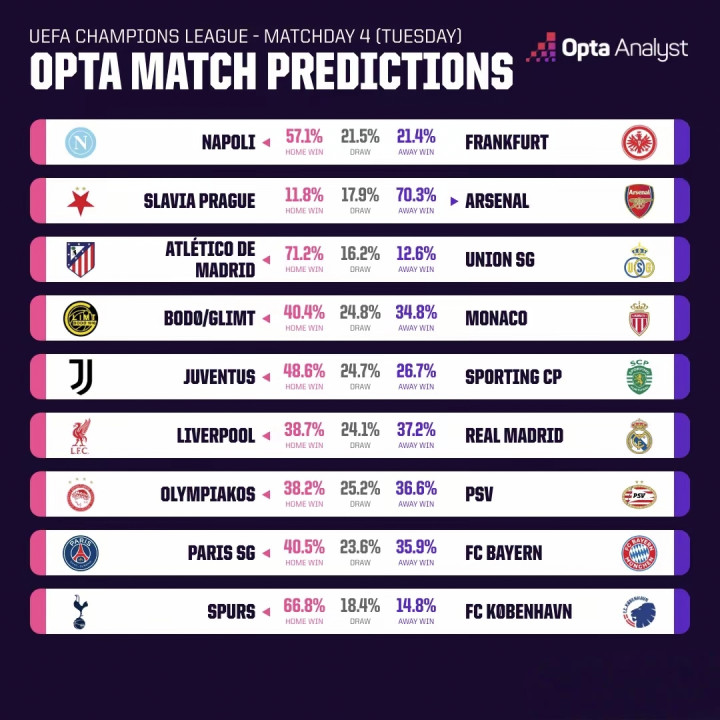 The following are OPTA's predictions of win, draw and loss probabilities for each Champions League match in this round↓